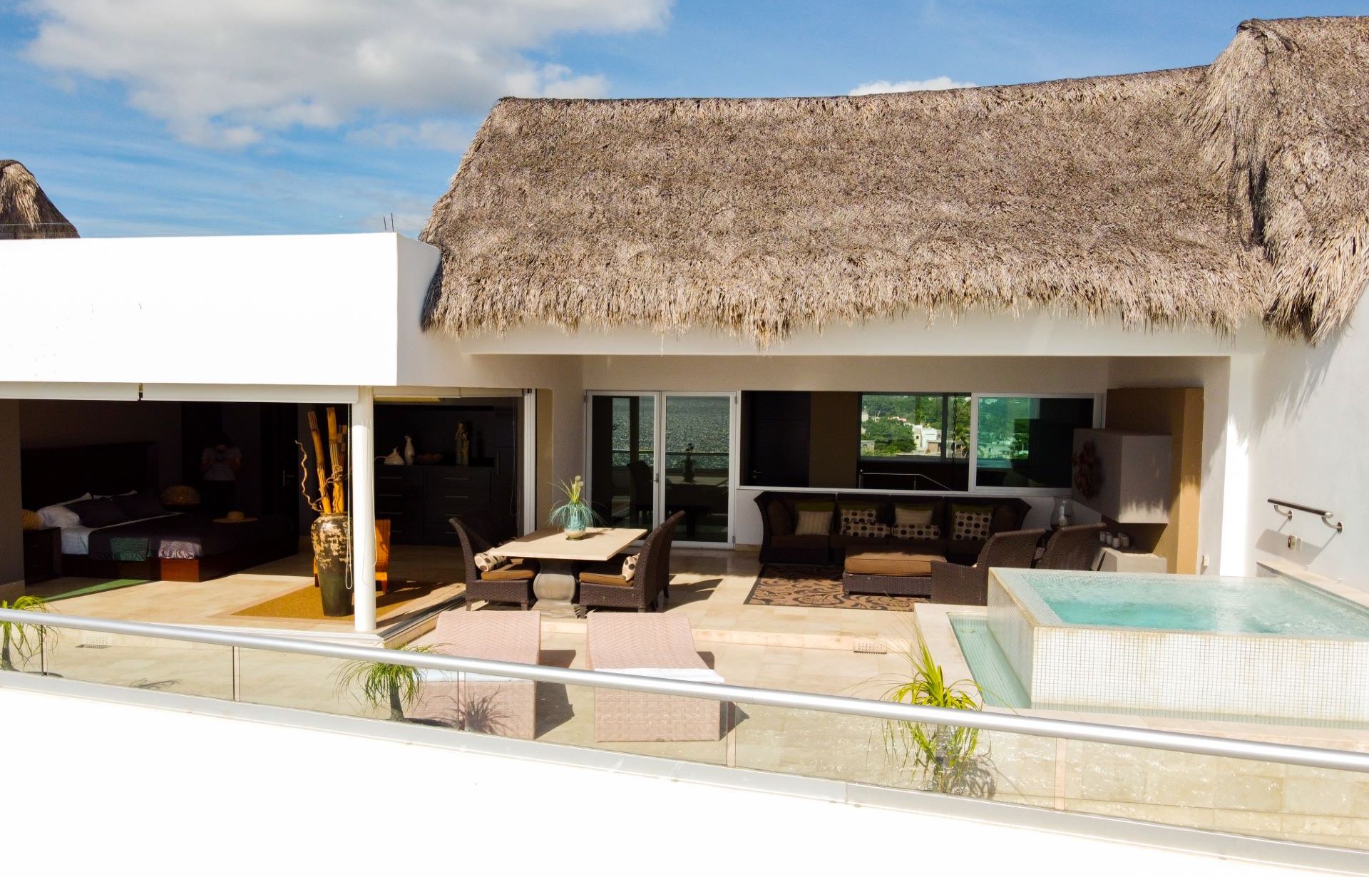 This spectacular one-of-a-kind unit is a two-story penthouse unit that sleeps 6. The main level offers an open plan living / dining / kitchen with sliding doors that open fully to a huge terrace overlooking the Bay of Banderas. When you want to catch up on the latest streaming program, relax in the den on a top of the line, comfortable sleeper sectional. This sectional can be converted to add sleeping for two more individuals. There are two bathrooms on the main level.